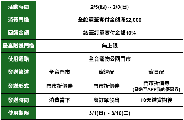 會員當日消費扣除適用折扣優惠券並排除特殊優惠商品,商品結帳實付金額滿 2,000元(含)以上,即可獲贈「現金折價券」。分批取、美容、住宿、水手兩棲爬蟲異寵櫃位、水族星球櫃位、魚部落專櫃恕不參與本優惠活動。折價券面額依「商品結帳實付金額 × 10%」計算,小數點後採四捨五入,面額無上限。折價券將於結帳後由收銀櫃台直接列印發放。門市及寵速配現金折價券需於 2026年3月1日至2026年3月10日期間使用,逾期無效。折價券無消費金額限制,且折抵金額無上限。現金折價券限寵物公園會員本人使用,不可轉讓或贈送他人。門市/寵速配折價券為實體票券(寵日配為 APP 優惠券),塗改、影印或以任何形式複製皆屬無效。折價券如有破損無法辨識、遺失或逾期,恕不補發。使用折價券折抵時,需於結帳前出示實體票券,截圖或翻拍無效。折抵後,折價券將由櫃檯人員收回。每張折價券需一次性使用完畢,不可重複使用、不找零、亦不可儲值且不與任何優惠同時併用。辦理退貨時,需一併退回現金折價券,否則恕不接受退貨。折價券全品項皆可折抵但不適用於美容服務、住宿服務、藥品、水手兩棲爬蟲異寵櫃位、水族星球櫃位及魚部落專櫃。萬達寵物保留修改、變更、暫停或終止本活動內容之權利,恕不另行通知。